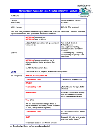 Merkblatt für Notruf via VHF Seefunk